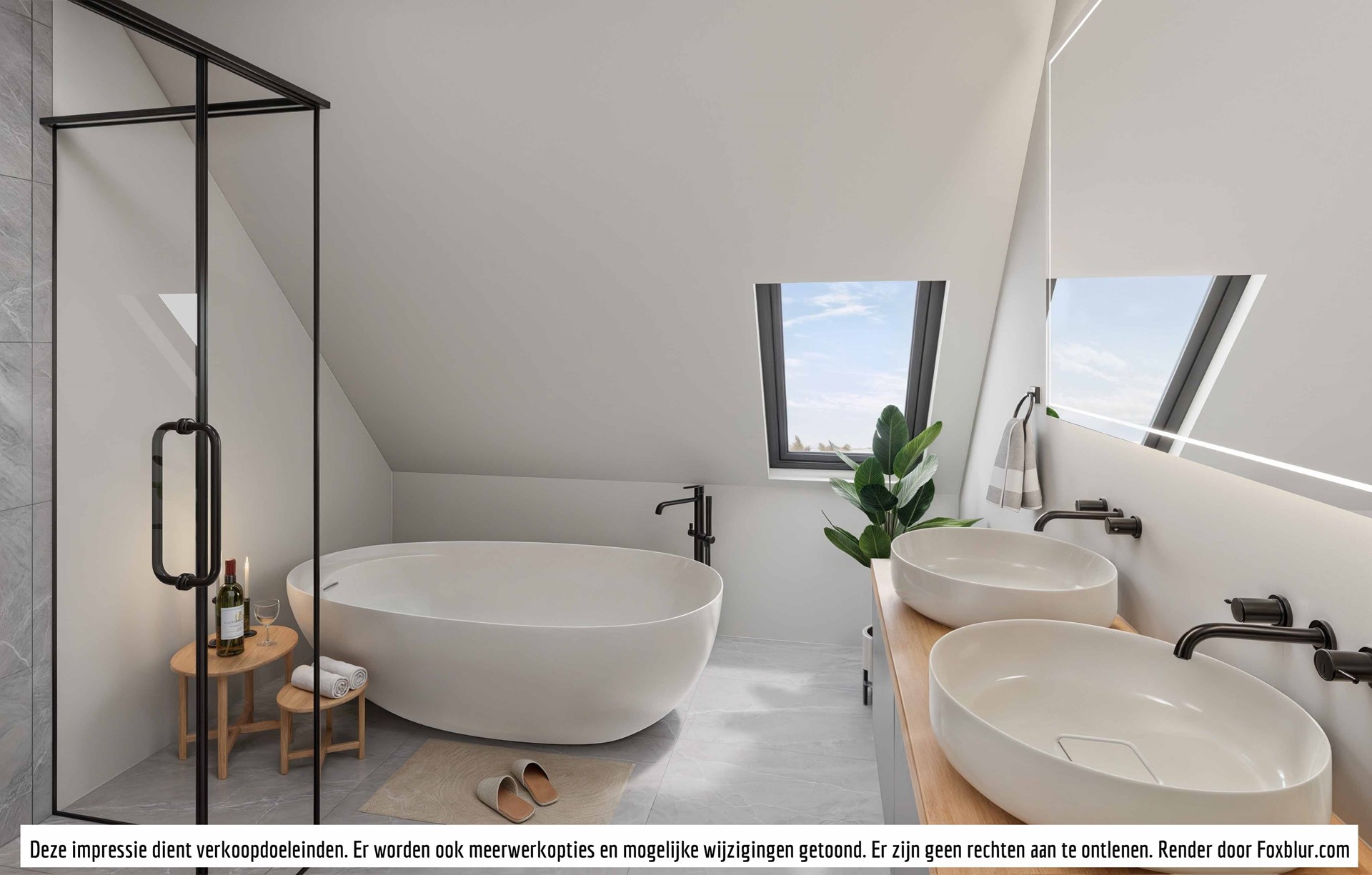 Aan de achterzijde zijn de badkamer en een separate toiletruimte. Beide ruimtes worden casco opgeleverd, maar met de benodigde aansluitingen. In de badkamer is er een beoogde indeling met een ligbad, inloopdouche en een dubbele wastafel.